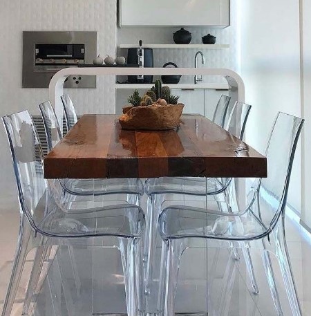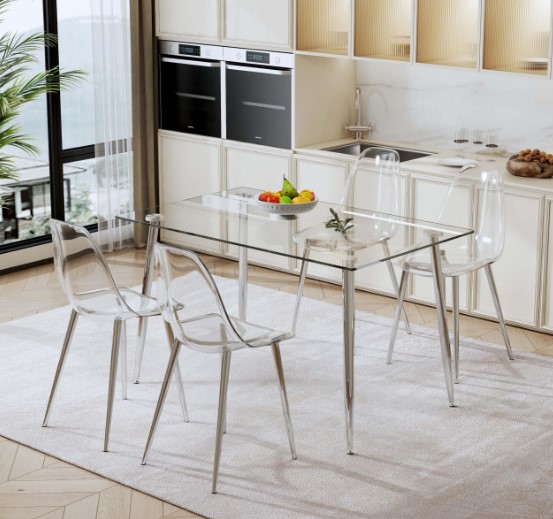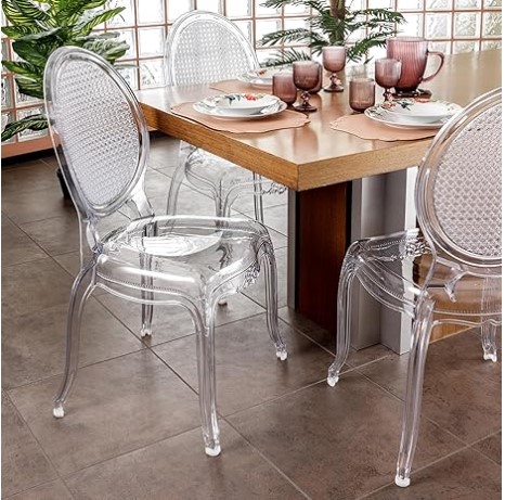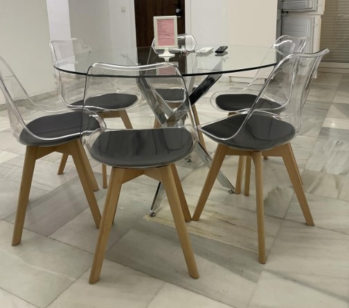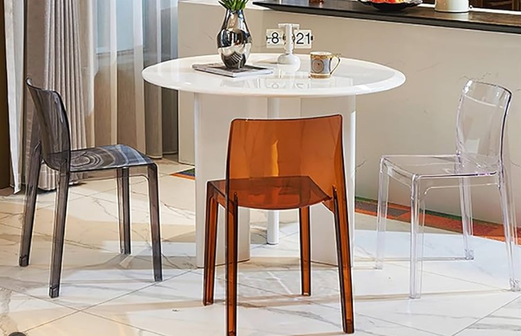 He tenido sillas transparentes alrededor de una mesa y la sensación es casi mágica: parece que la mesa flota. El espacio se siente más amplio, más ligero, más ordenado… incluso aunque haya muchas cosas alrededor.