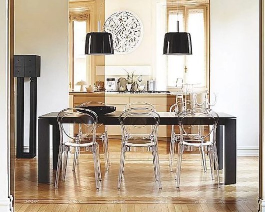 Sillas transparentes en los laterales y dos sillas tapizadas o de madera en las cabeceras. Ganas:
